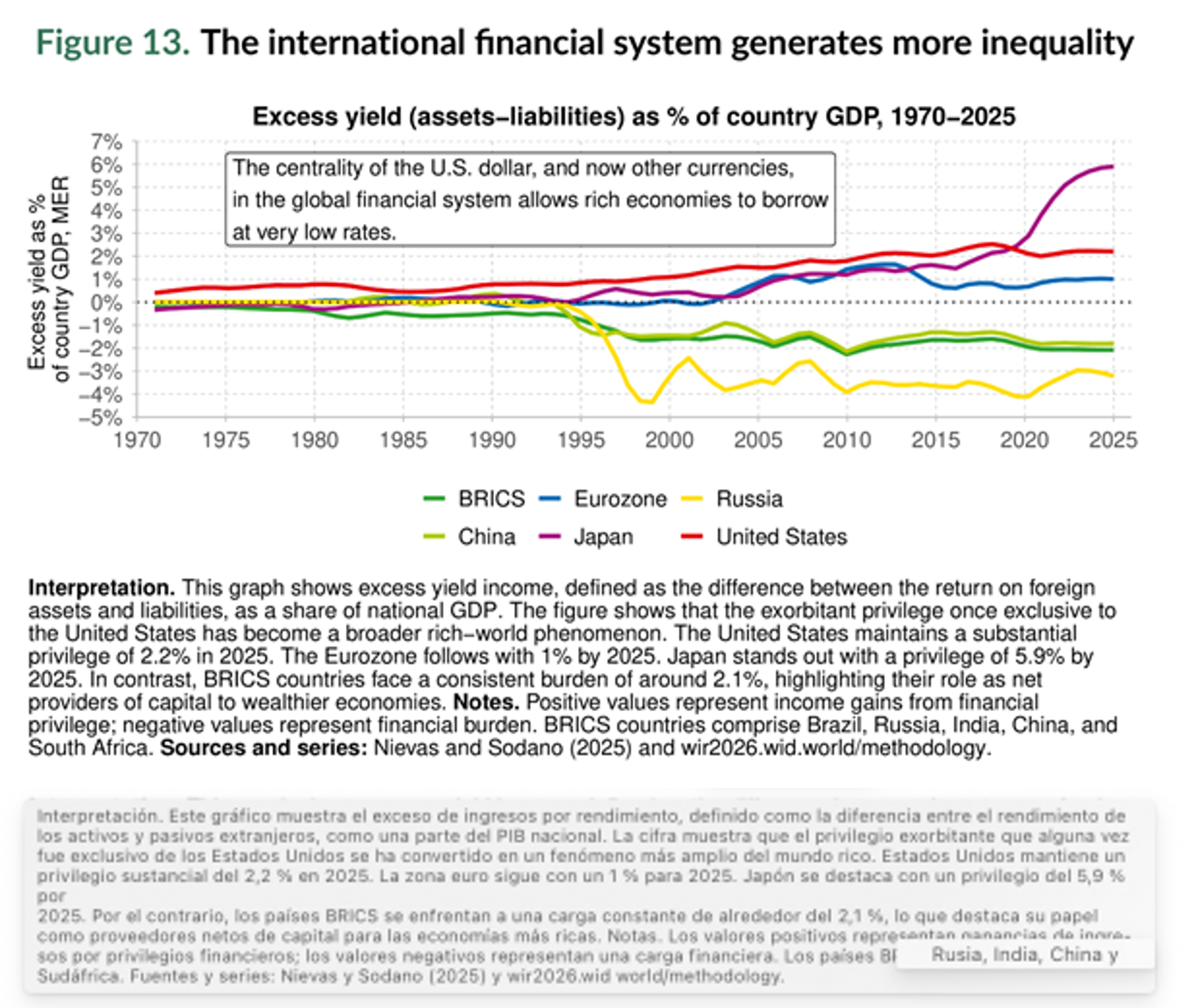 La desigualdad también está profundamente arraigada en el sistema financiero mundial. La arquitectura financiera internacional actual está estructurada de manera que genera sistemáticamente desigualdad. Los países que emiten monedas de reserva pueden pedir préstamos de forma persistente a un coste menor, prestar a tipos más altos y atraer el ahorro mundial. Por el contrario, los países en desarrollo se enfrentan una situación inversa: deudas caras, activos de bajo rendimiento y una salida continua de ingresos