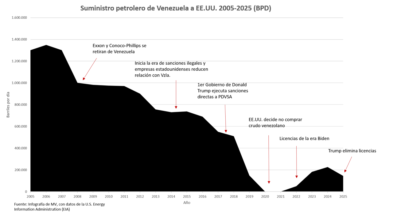 Según los datos de la U.S. Energy Information Administration (EIA, por sus siglas en inglés), en el año 2005 Venezuela ofrecía a Estados Unidos la cuenta de 1 millón 300 mil barriles de petróleo al día (bpd). En cambio, para el año 2025, se despacharon apenas 145 mil bpd, según la misma fuente.