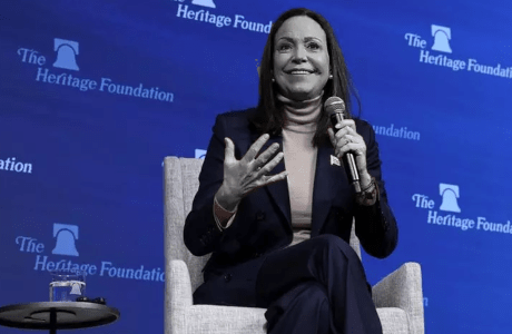 En ese escenario —uno de los centros ideológicos más influyentes de la derecha conservadora— Machado presentó una narrativa de transición inevitable, atada explícitamente al apoyo del pueblo estadounidense y del presidente Donald Trump.