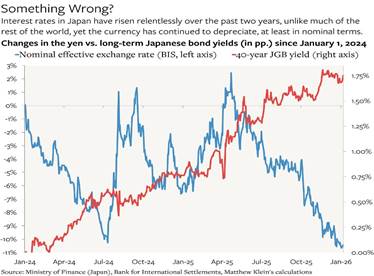 De hecho, el superávit comercial real de Japón en bienes y servicios está cayendo actualmente a una tasa anual del 15 %. Por lo tanto, la esperanza de Takaichi de que permitir la caída del yen impulse de alguna manera las exportaciones japonesas y reactivar el crecimiento económico es una ilusión.