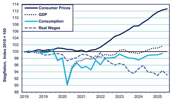 En lugar de estancamiento, la economía japonesa se ha transformado ahora en estanflación, con precios en alza, PIB y gasto de consumo estancados y salarios reales a la baja. Los precios al consumo han subido un 12 % desde 2021. Al mismo tiempo, el PIB apenas es superior al de 2018. El gasto, a su vez, está estancado porque los salarios reales han bajado un 7 % con respecto a su nivel de 2018.