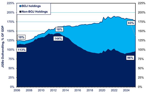 El riesgo de fuga de capitales solo reside en la parte en manos de inversores privados, la deuda neta. Y esta última es menor de lo que ha sido en décadas, principalmente porque el Banco de Japón ha comprado gran parte de la deuda desde 2013. A principios de 2013, la deuda pública neta en manos de acreedores privados alcanzó un máximo del 144 % del PIB. Hoy en día, equivale solo al 96 % (véase el gráfico siguiente).