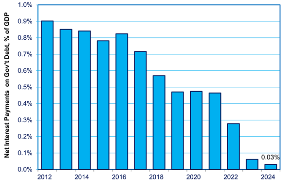 Sí, los rendimientos de los bonos han subido, pero la reducción de la deuda neta y los tipos de interés ultrabajos anteriores han reducido los pagos de intereses netos en todos los niveles de la administración pública hasta un insignificante 0,03 % del PIB en 2024, frente a casi el 1 % en 2012. Esto es fácilmente manejable.