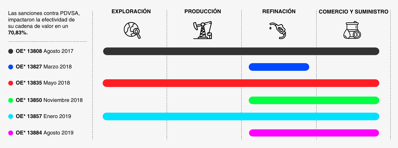 La cadena de valor de Pdvsa sufrió un impacto del 70,83% en su efectividad operativa. Las sanciones secuenciales afectaron la exploración, producción, refinación y comercio, restringiendo el acceso a tecnología, repuestos y servicios especializados.