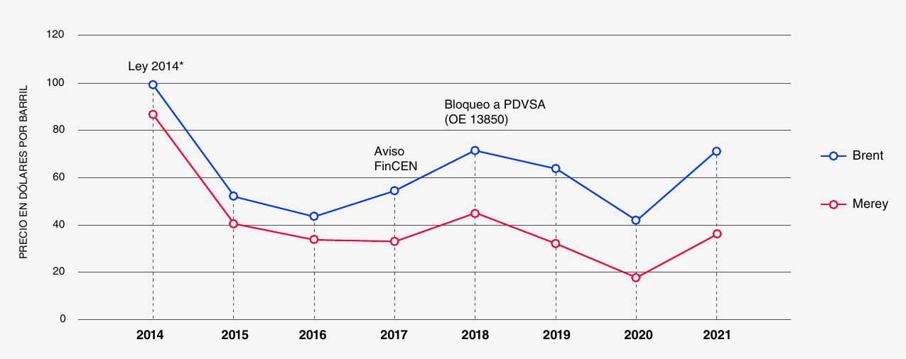 El diferencial de precios entre el crudo Merey venezolano y el Brent alcanzó descuentos de hasta 40% en 2018, con precios de venta de 18 dólares por barril en 2020 frente a los 41 dólares del referencial internacional.