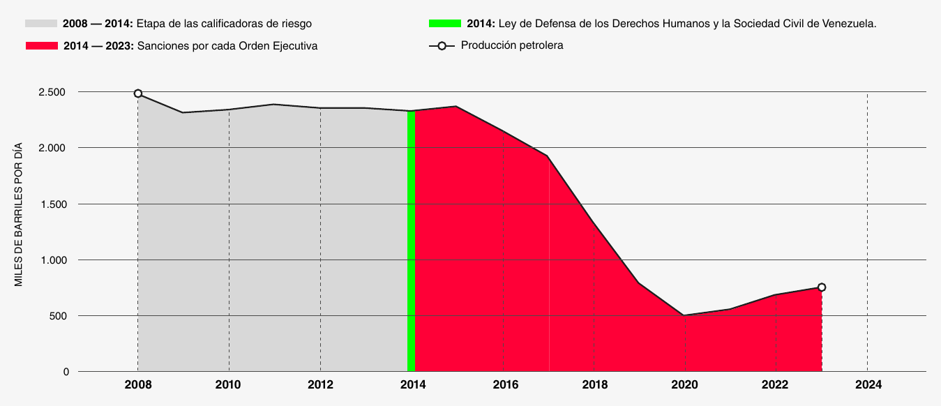 Un estudio de Francisco Rodríguez sobre el tema documenta que la caída de la producción petrolera venezolana se aceleró de -1,0% mensual entre enero de 2016 y agosto de 2017 —mes de las sanciones financieras— a -3,1% mensual durante los siguientes 16 meses.