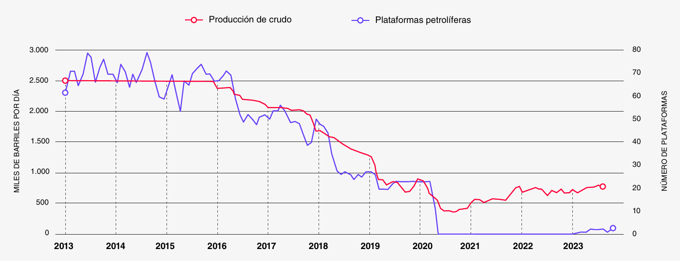 El número de plataformas petrolíferas operativas cayó en correlación directa con la producción, evidenciando que el colapso no respondió a factores endógenos de gestión sino a la imposibilidad material de operar bajo restricciones financieras y comerciales extremas.