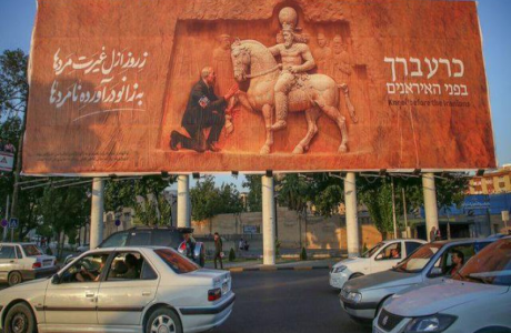 Foto: Una nueva valla publicitaria en Teherán muestra al primer ministro israelí, Benjamin Netanyahu, arrodillado ante un antiguo emperador persa, con la leyenda en farsi: “Desde el principio de los tiempos, los hombres de verdad siempre han obligado a arrodillarse a los que no lo son”.