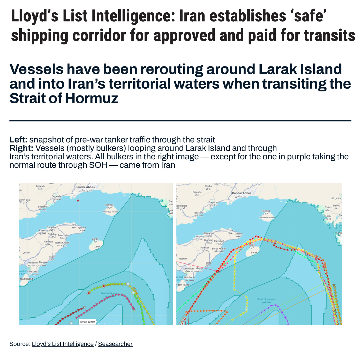 Varios gobiernos —entre ellos los de India, Pakistán, Irak, Malasia y China— mantienen conversaciones directas con Teherán, coordinando los tránsitos de buques a través de un sistema emergente de registro y control gestionado por el IRGC… Lloyd’s… tiene entendido [que] se espera que el IRGC establezca un proceso de autorización de buques más formalizado en los próximos días.