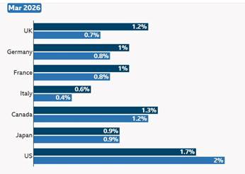Argentina registrará la tasa de inflación más alta del G20, con un 31 %, y China la más baja, con un 1,3 %. La inflación de EE. UU. se disparará hasta el 4,2 % desde el 2,9 % actual. Si la guerra se prolonga hasta el próximo trimestre, cabe esperar que estas previsiones de crecimiento se reduzcan aún más y que se revisen al alza las previsiones de inflación.